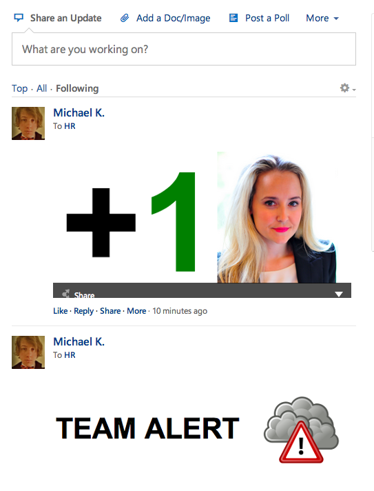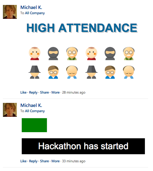 Making the Yammer feed interesting. This hack let's people communicate work related, or group related messages using images.